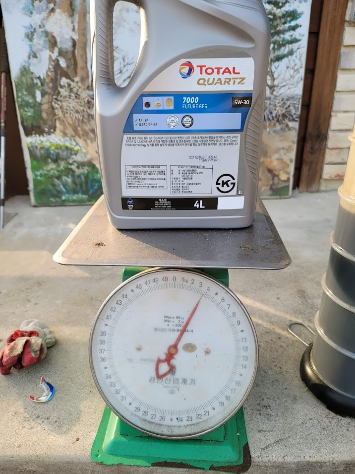 아래 사진을 보면 통까지 해서 신유상태일때의 무게는 약 3.7kg이며 오일주입후 빈통의 무게를 재어보니 200g 정도로.. 오일만의 무게는 약 3.5kg 인 셈이다.