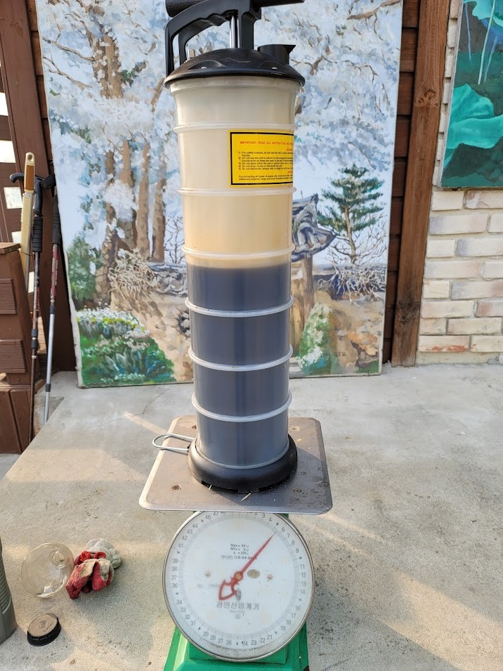 저울의 무게상으로 3kg가 추출되었으므로 3kg / 0.87kg/L 을 해보면 3.4리터 정도 나오면 맞는셈. 물론 추출할때의 온도는 25도보다는 훨씬 높았으므로..(시동off후 약 10분 뒤 추출하였다. 통을 만져보면 약간 뜨거운 상태..) 얼추 맞는 것 같다.