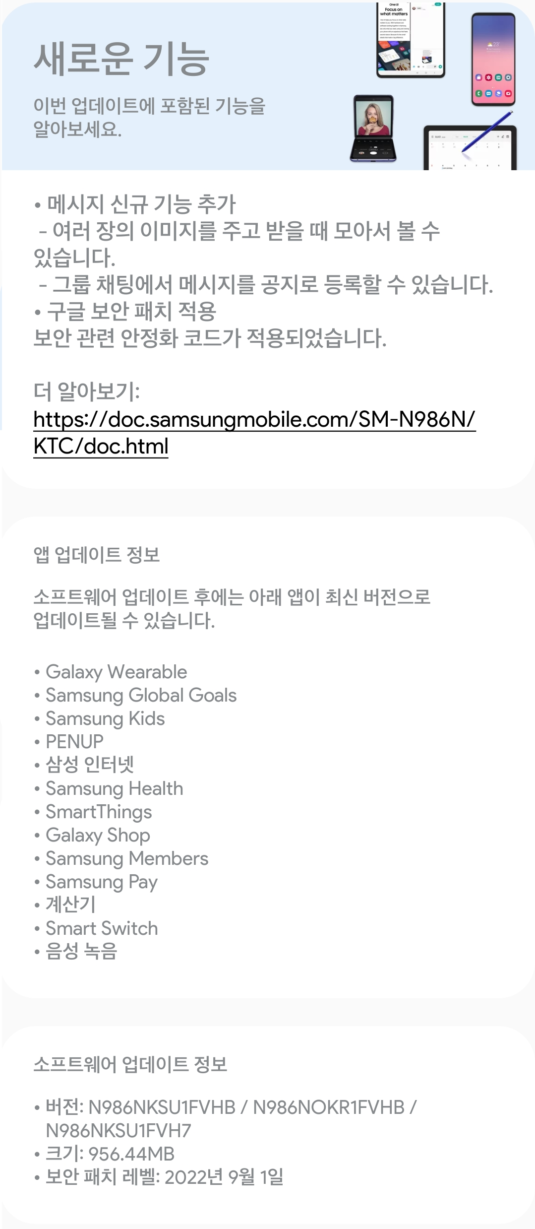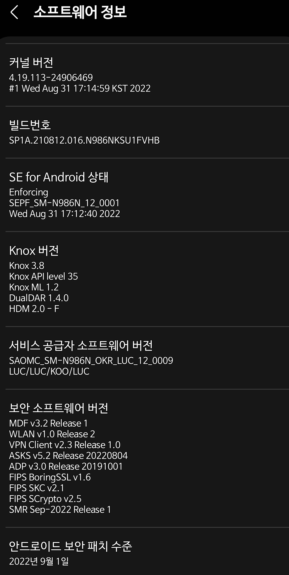 삼성 갤럭시 노트20 울트라 5G 모델의 2022년 9월 신규 업데이트이다.