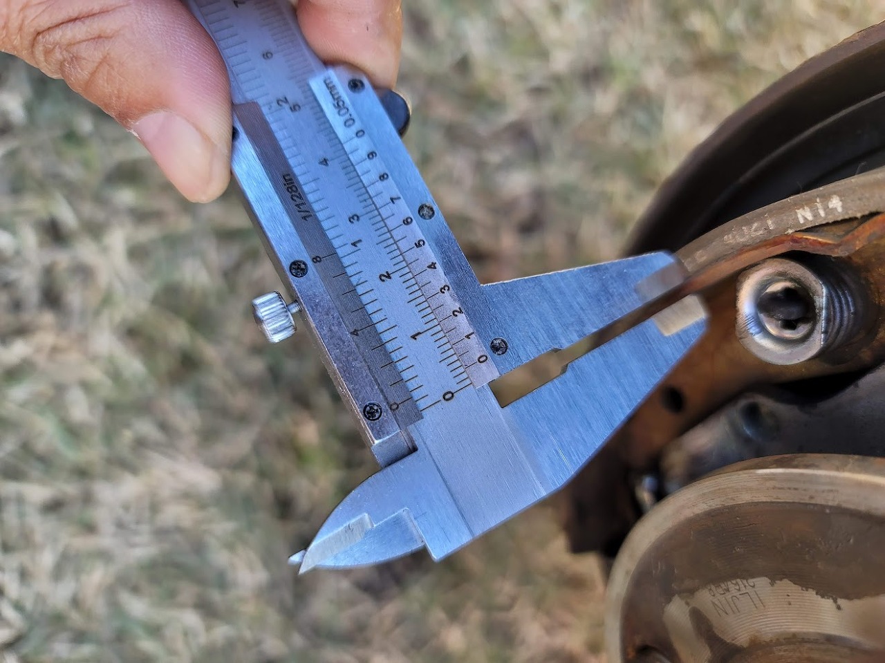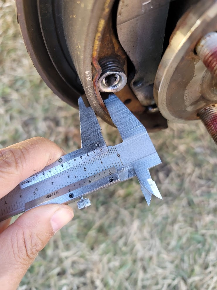 위의 사진과 같이 라이닝(슈)가 붙어있는 철판 부분과 양쪽 모두 측정한 결과 두꺼운 쪽이 7.9mm 라이닝 뒤쪽 철판이 2.55mm이므로 차이를 보면 라이닝(슈)의 잔여두께는 현재 7.9-2.55=5.35mm 이다???