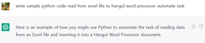 이번에는 과연 학습한 데이터 중에 한글 워드 프로세서 자동화 코드도 알고 있을까 싶어 아래와 같이 질문해보았다.