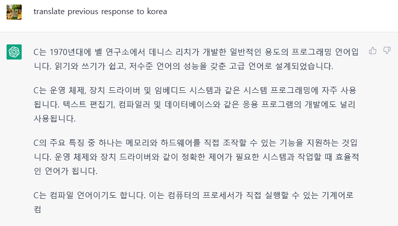 이전 답변을 번역해줘 라고 해도 아래와 같이 잘 번역해서 보여준다.