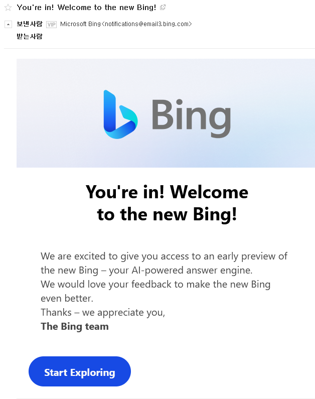 오늘 출근해서 보니 대기가 풀려서 이제 bing ai chat 을 사용할 수 있다는 메일이 왔다!