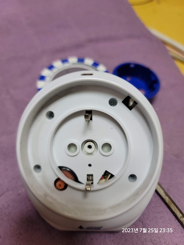 24시간동안 한바퀴를 돌아갈수 있게 해주는 감속기어로 구성된 모터? 부분과 시간설정 링 모양 부품의 레버가 건드리면 스위치가 켜지도록 하는 부분이 보인다.