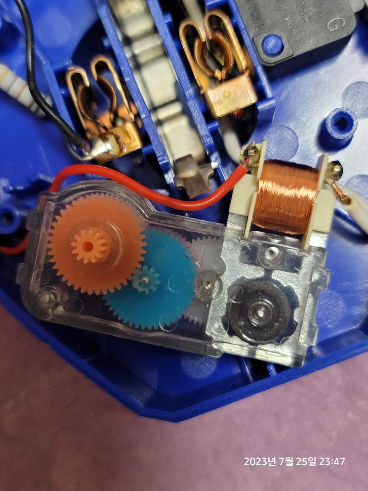 대략 저 모터의 감속기와 맞물린 마지막 피니언 기어에 의해서 15분당 7도(기어잇수 2개 정도?) 정도 돌아가도록 기어비가 설정되어있는 듯 보인다.