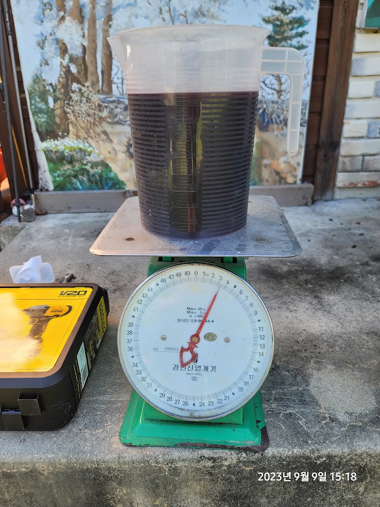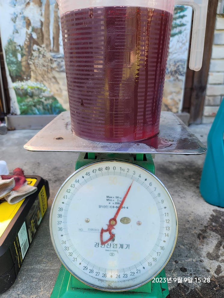 총량이 7.5리터인데 뽑아낸 양은 4리터 정도이므로 53% 정도가 추출되었다.