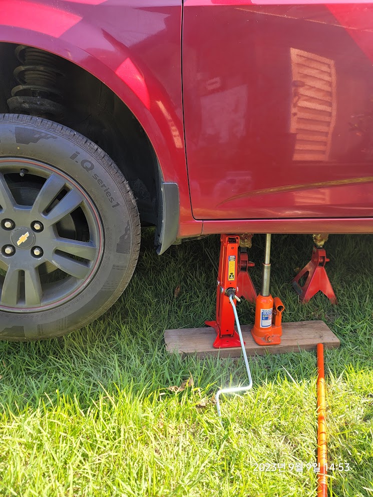 그리고 미션은 운전석쪽으로 치우쳐 있으므로 운전석 쪽으로 차량을 들어올릴 작기 2개와 안전말목 2개를 준비하였다.