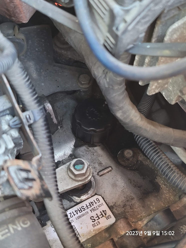 일단 한번 뽑아낸 양만큼 다시 주입한후 시동을 걸어서 브레이크를 꽉 밟은 상태로 미션레버를 P-R-N-D-M(1단~3단) 을 각 단마다 30초이상 대기하며 3회 정도 왔다갔다 해주었다.(미션의 벨브바디 솔레노이드 밸브가 열리고 닫히며 기존 미션오일과 신유가 잘 섞이도록)