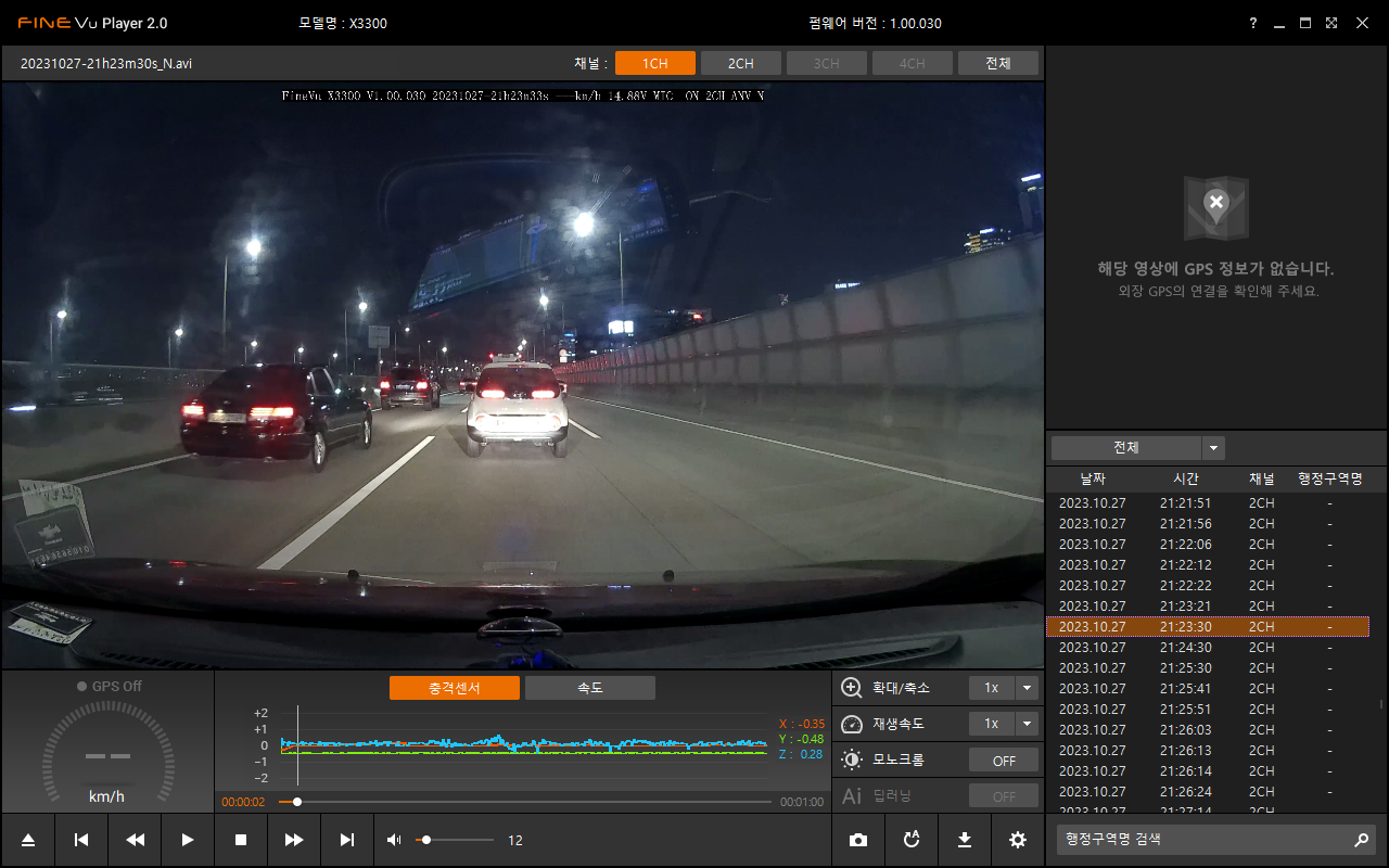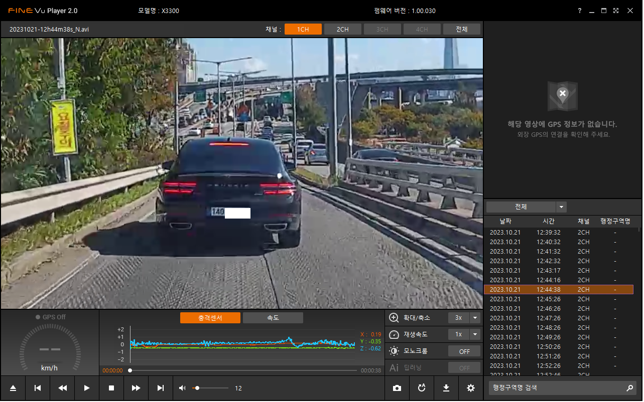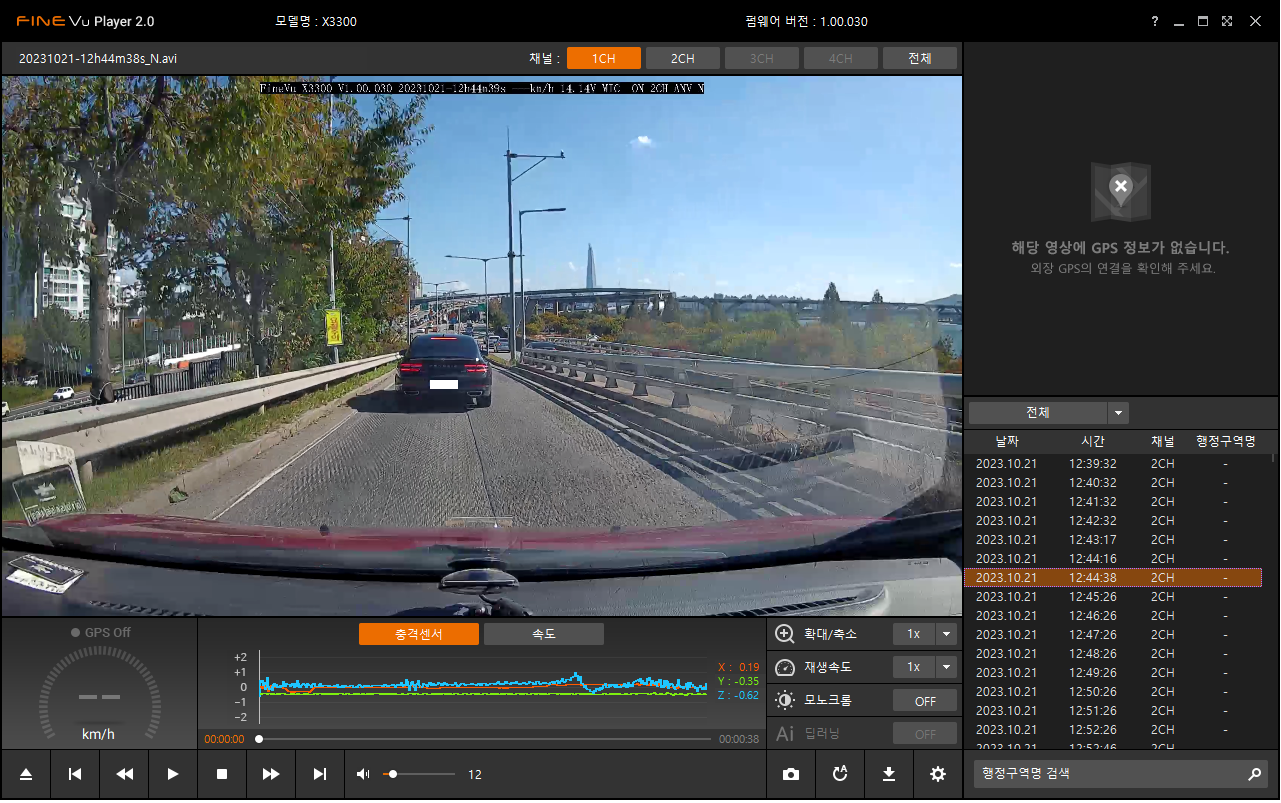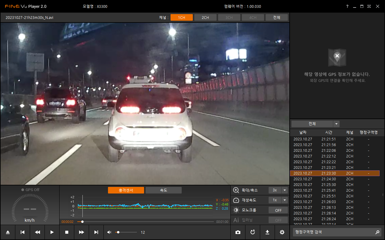 아마도 일반적인 avi 포멧을 살짝 바꾸어서 후방영상도 하나의 파일로 저장되도록 한 모양이다.(차라리 후방영상 파일이름을 다르게 해서 저장되게 하면 안되나 하는 생각이 들었다. 왜냐하면 파인뷰 플레이어의 UI나... 반응속도나... 여러모로 그다지 맘에 들지 않기 때문이다. 특히 화면 크기는 기본크기와 전체화면 두가지 중에 하나로밖에 보지 못한다... 초기 파일목록 리스트업 하는 속도도 좀 느리고... 다음파일 영상으로 넘어갈때 랙도 있는 편이며... 중간중간 응답을 멈추는 케이스도 프로그램 사용 몇분만에 발견되었다.. ㅡ.ㅡ;;; )