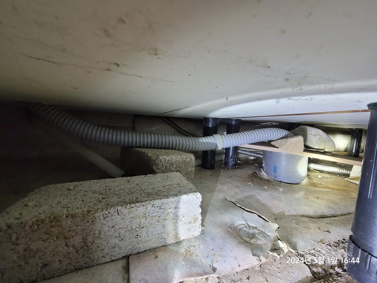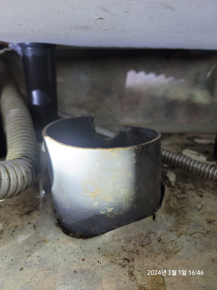 기존에 배관에 대충 얹혀져있던 것을 제거하고 보니 보다시피 배관 한쪽이 살짝 깨져있다. ㅡ.ㅡ;;;