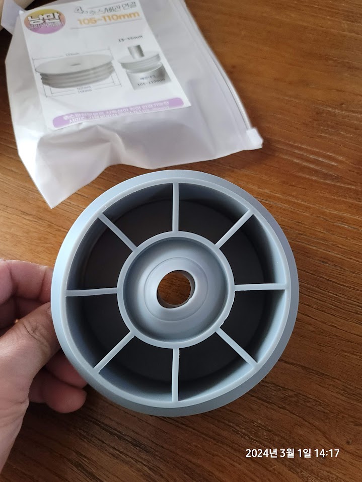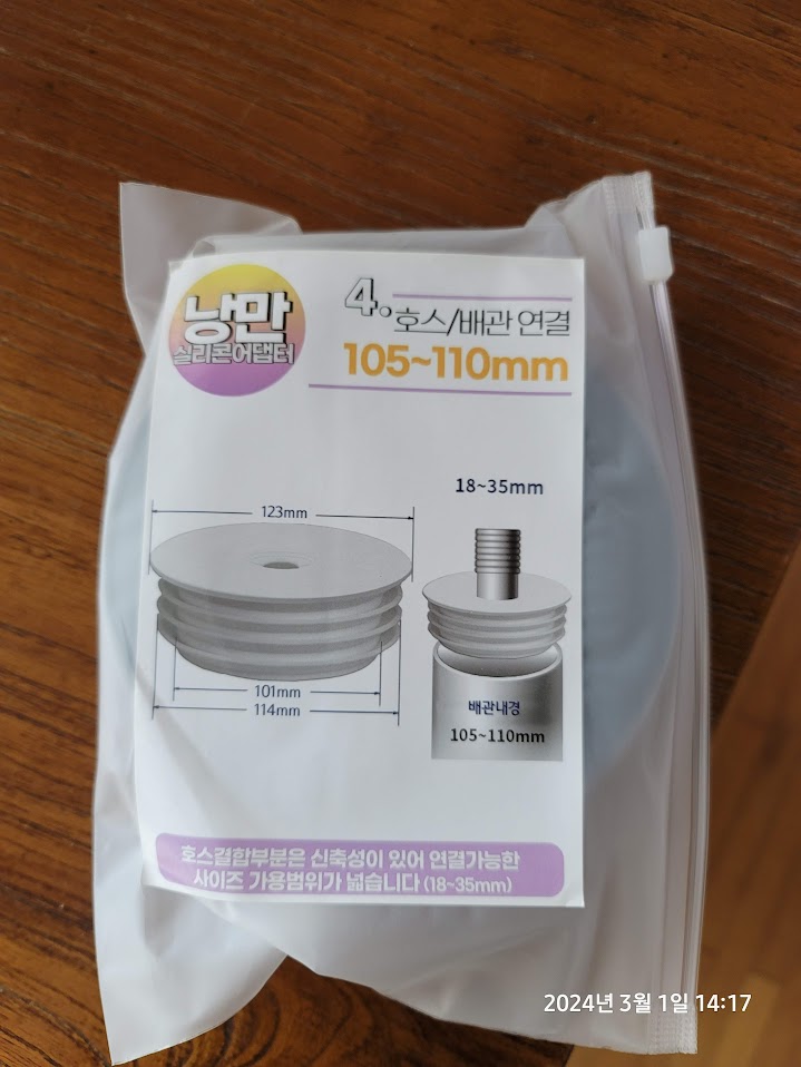 실리콘 어댑터에 싱크대 배관을 꼽아보니 딱 맞게 잘 들어가주었다.