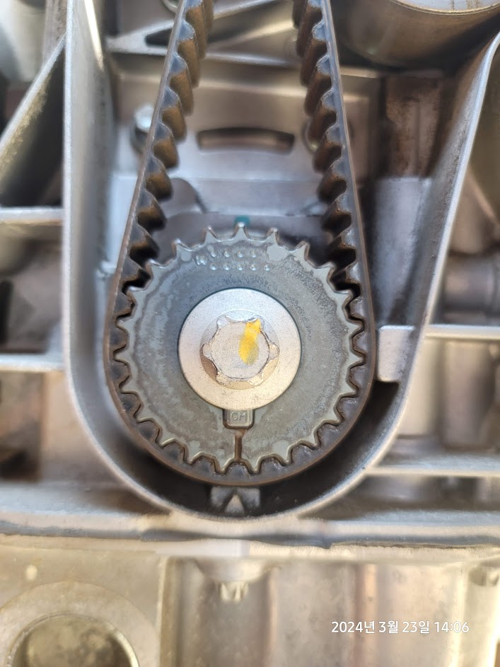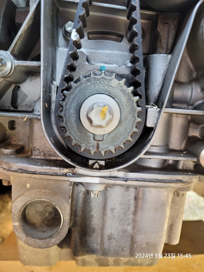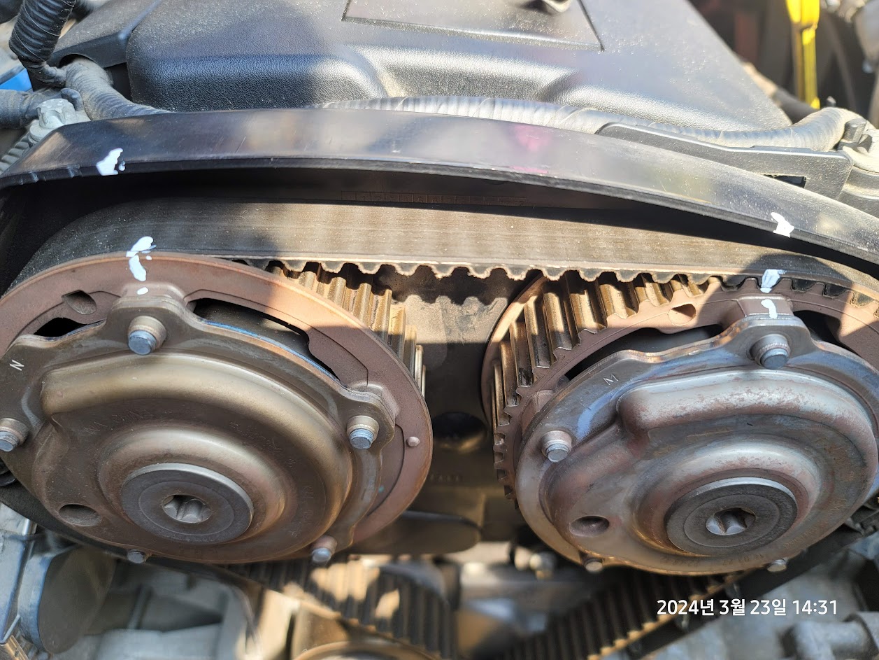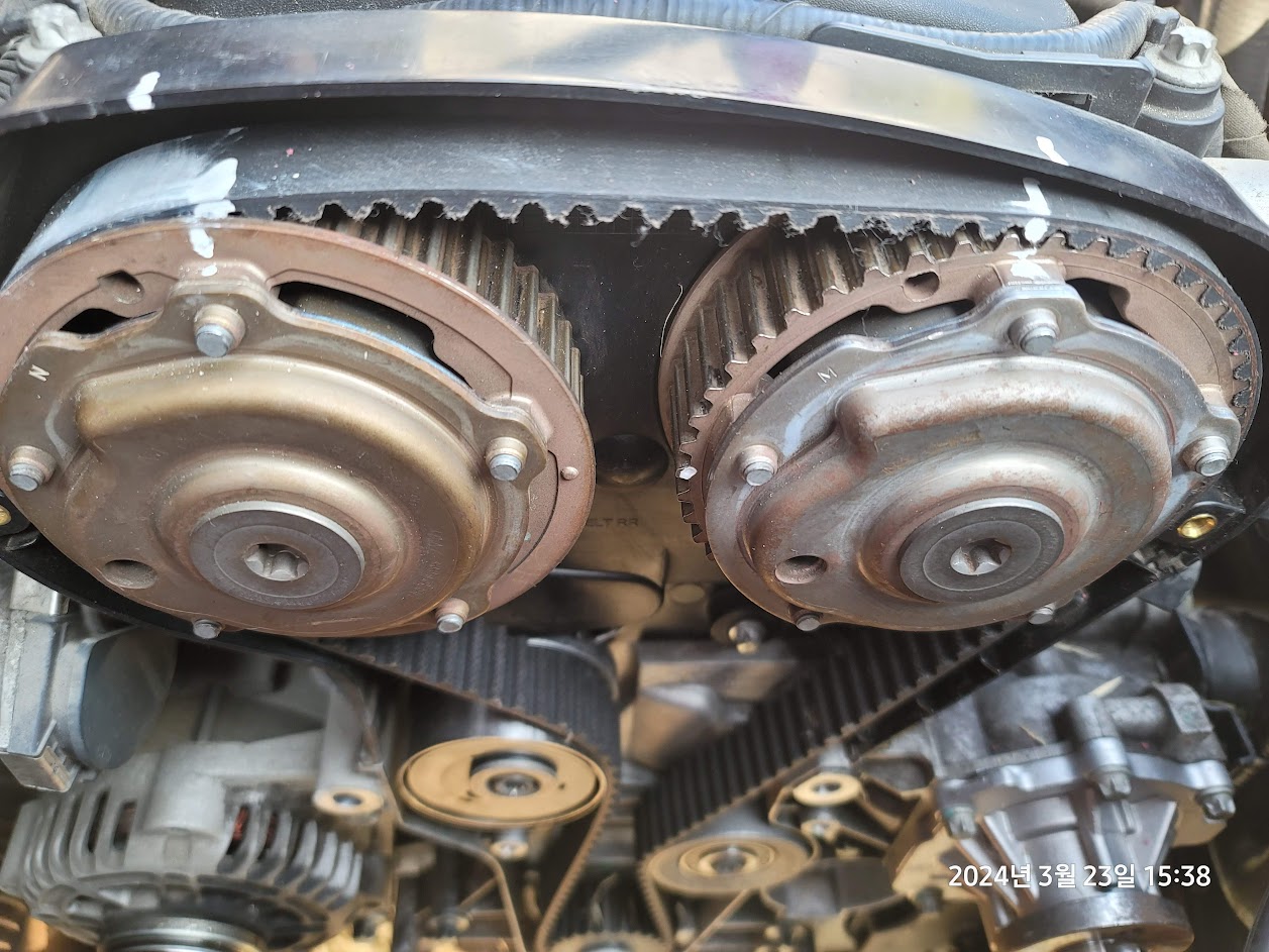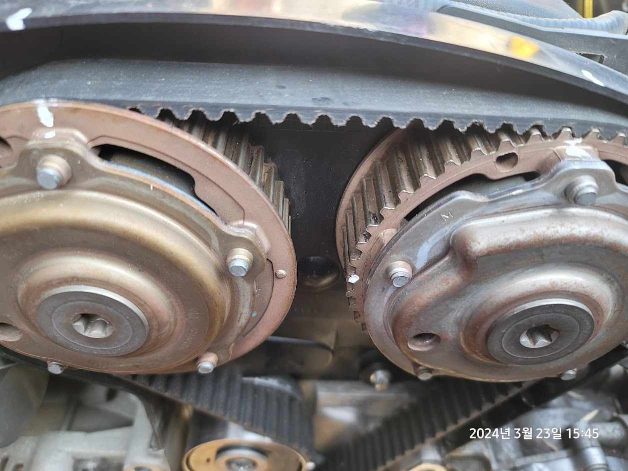 크랭크풀리를 두바퀴 돌려서 각 캠축(흡기/배기)의 정렬이 맞는지 확인하면 된다.