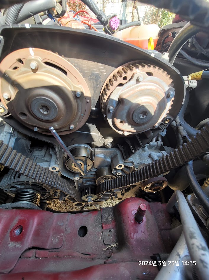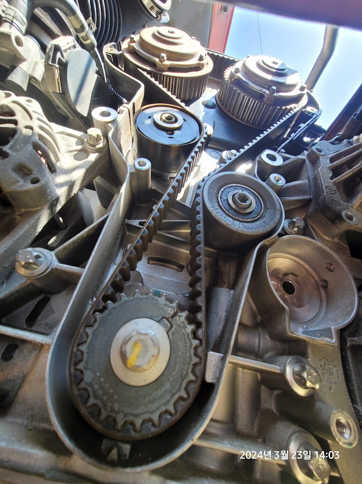자 이제 풀리류 및 워터펌프를 탈거하고 장착까지 완료하였으니 타이밍벨트를 다시 걸어줄 시간이다...ㅎㄷㄷ