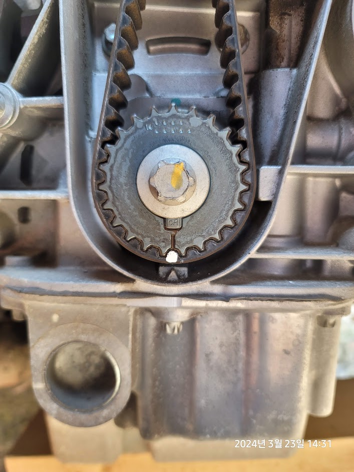 긴장된 마음으로 다시 위로 올라가서 확인해보니 다행히 흡기캠쪽의 마킹이 반코 올라가 있으니 정렬은 맞는 셈이다. ㅎ