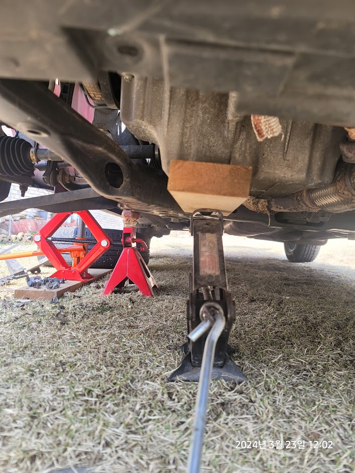 이후 조수석쪽바퀴를 탈거하고 난 다음 적당히 올리고(누워서 기어들어가서 하체 작업?이 가능할 정도의 높이로... 애매하다..) 안전말목으로 확실히 받쳐두었다.