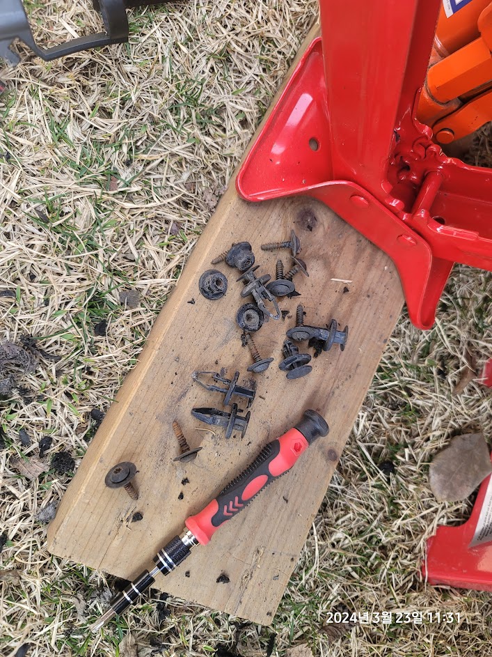하다하다 안되어서..결국... 범퍼를 약 85%? 정도 탈거하고...(조수석쪽은 100% 운전석쪽은 살짝..ㅎㅎㅎ..) 겨우겨우 볼트를 회수하였다... ㅎㅎㅎ