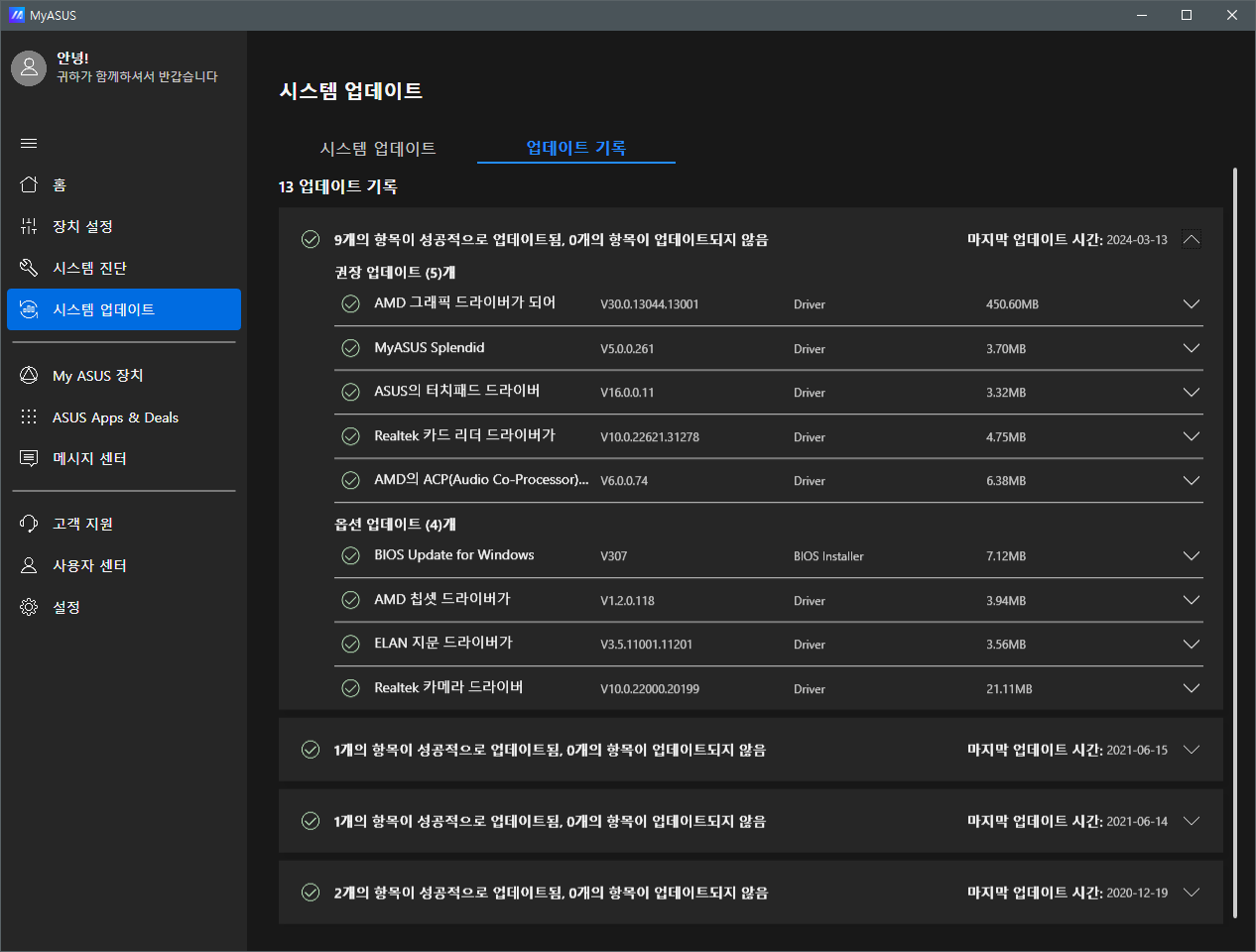 요즘은 집에 오면 노트북을 자주 켜지는 않아서... 오래 방치된 노트북을 오랜만에 켜주고 윈도우 업데이트도 해주고... MyAsus application을 실행하여 여러가지 드라이버 등 업데이트를 해주었다.