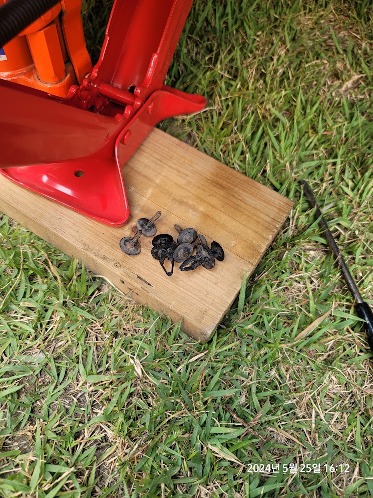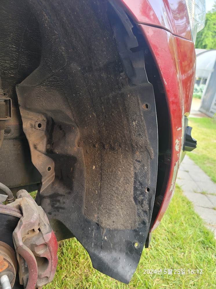 휠하우스 커버를 절반쯤 젖히려면 위와 같이 키 2개와 나사 5개를 풀러야 한다.(나사규격은 T10이었던가...그랬던거 같다.)