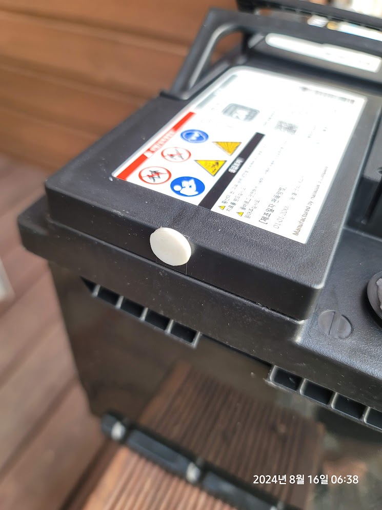일단 신품 배터리 양쪽의 고무마개를 제거해주고 구품 배터리를 탈거하여 구품 배터리의 양쪽 구멍을 신품 배터리에서 떼어낸 고무마개로 막아준다.(이동중 내부 황산용액이 배송중 넘치는 것 방지)