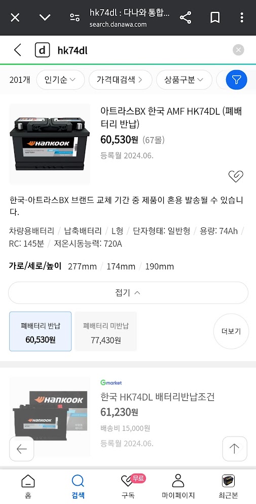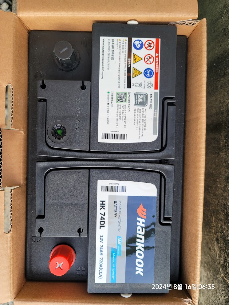 새로 배송된 배터리는 HK74DL 로 DL로 끝나는 것은 DIN 타입의 단자이고 단자를 내쪽으로 하고 봤을때 음극 단자가 왼쪽에 있는 배터리이다.