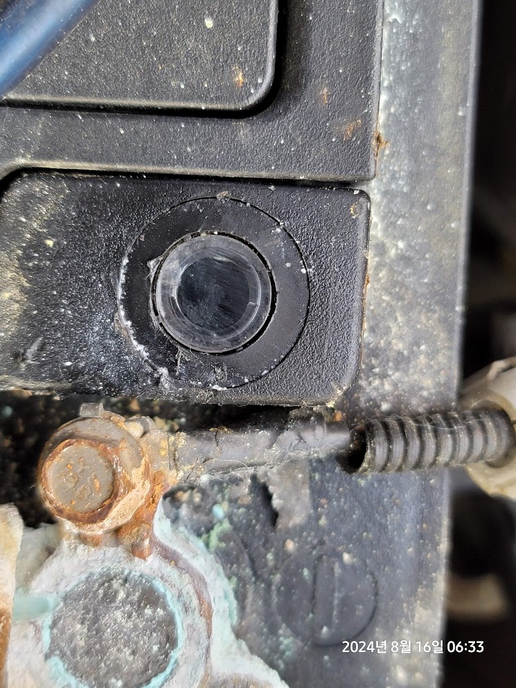 기존 배터리의 음극단자는... 상태가 뭐 거의 처참하다... 일주일에 한번 이상은 꼭 본네트를 열어서 음극단자를 청소해주고는 하는데.. 상태가 점점 안좋아지더니 이제는 인디케이터 창도 아래와 같이 검은색에서 돌아오지 않는다 ㅎㅎ