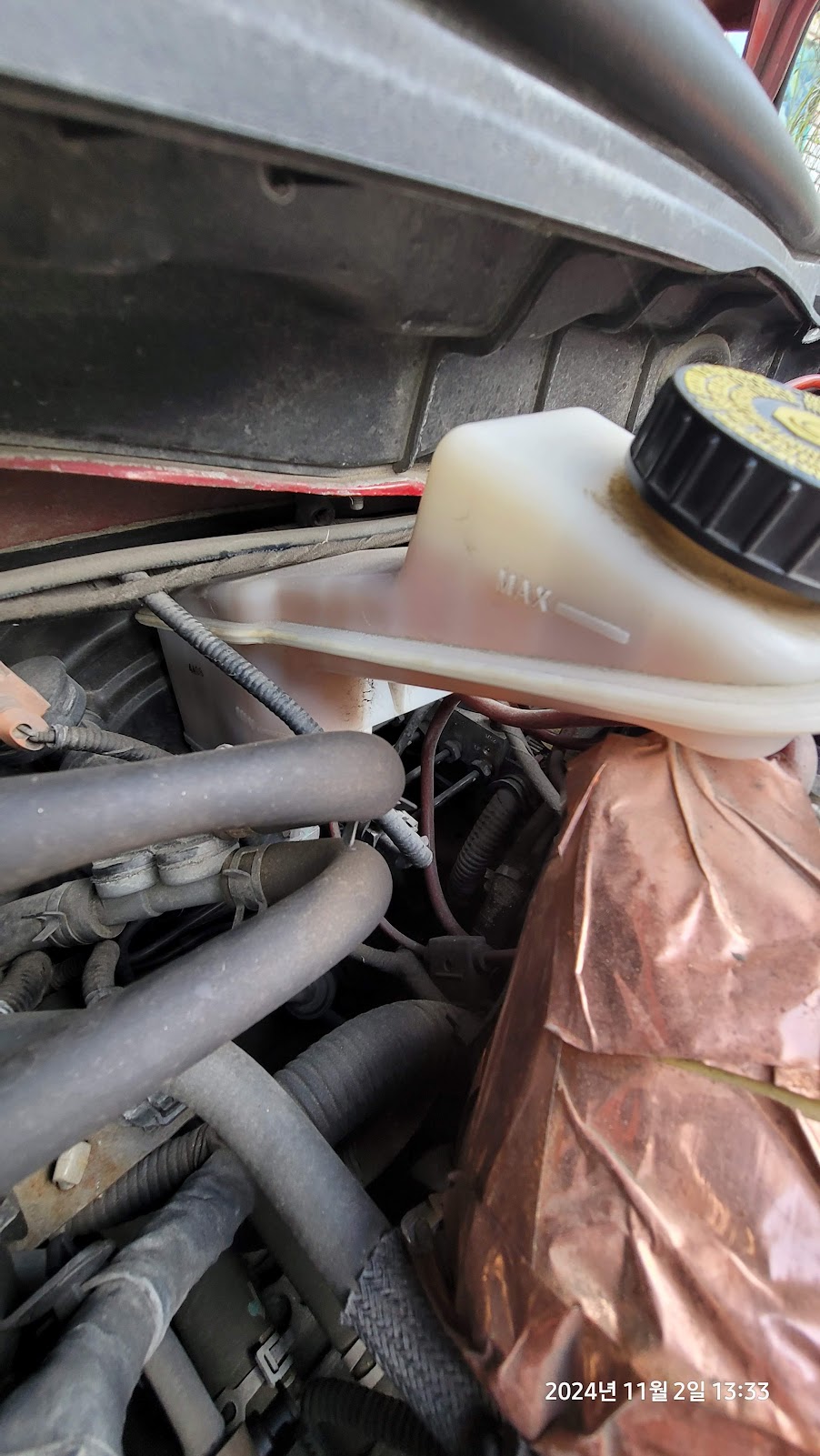 다음으로는 브레이크액의 레벨을 확인해본다. 이 또한... 문제가 단 한번도 없는 부분이지만.. 혹시 모르니 확인해본다.(제동계통 라인에서 브레이크액이 유출된다거나 하는 문제확인을 위해 필요.)