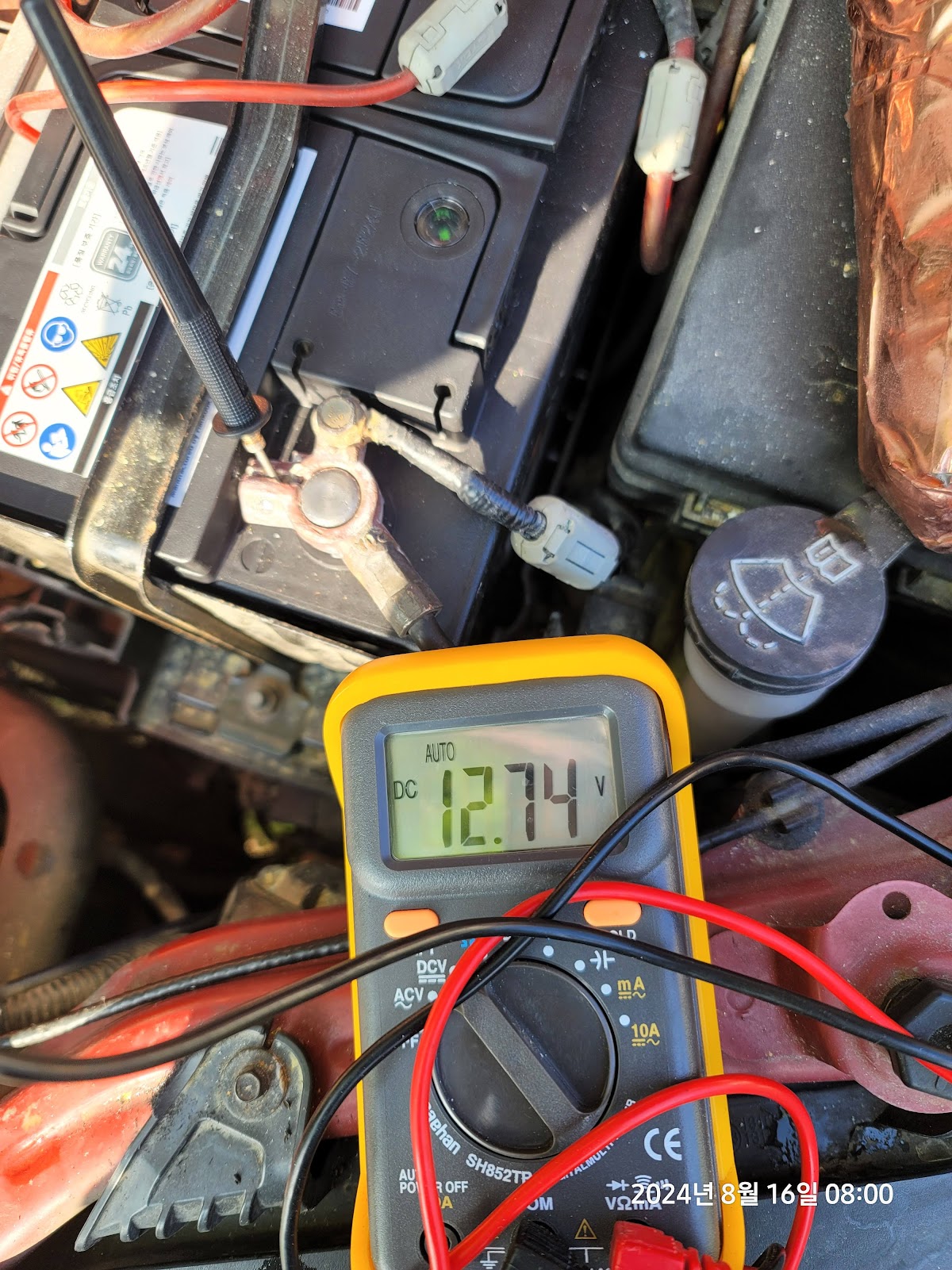 다음으로는... 베터리의 상태확인용 인디케이터를 확인해본다.. 녹색볼이 상단에 둥둥 떠있는 것 확인되면 정상이다.. 사진상으로는 옆으로 살짝 숨어있다... 그리고 어차피 운행하면 전압변동상태를 계속 모니터링하므로.. (알터네이터에서 발전은 잘 되는지... 충분히 충전될만큼 주행후 발전전압 레벨이 떨어지는지 등...) 굳이 확인은 안해도 되지만 꼭 한번은 보게 된다.