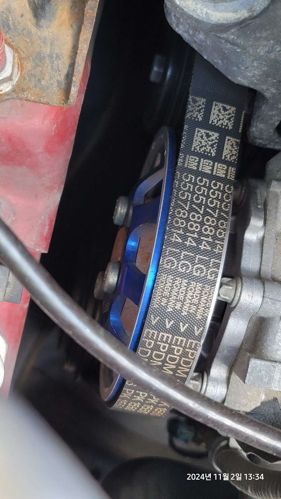 다음으로는 악세사리 벨트(겉벨트)의 상태를 확인해본다. 9만 즈음에 한번 교환하고... 현재 17만km이니.. 아직은 1,2년은 더 타도 될 듯 싶다.. 그리고 혹시모를 경량풀리에 균열이 가지는 않았는지 확인해본다.(순정풀리면 신경 안써도 되겠지만.. 예전에 워터펌프 경량풀리에서 균열이 발생한 적이 있다..ㅎㅎ.. )