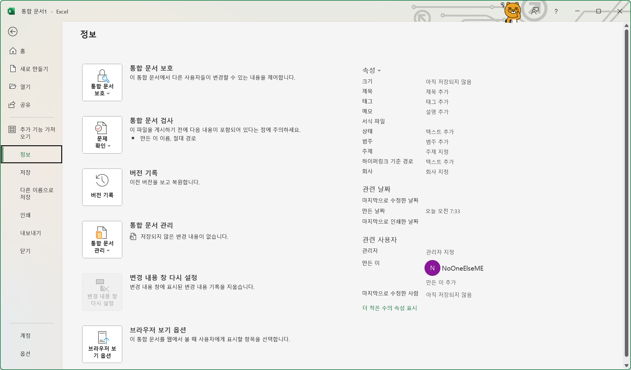 엑셀파일을 아무거나 하나 열어서 파일탭의 정보를 눌러보면 아래와 같이 해당 엑셀파일에 대한 정보가 나오게 된다.