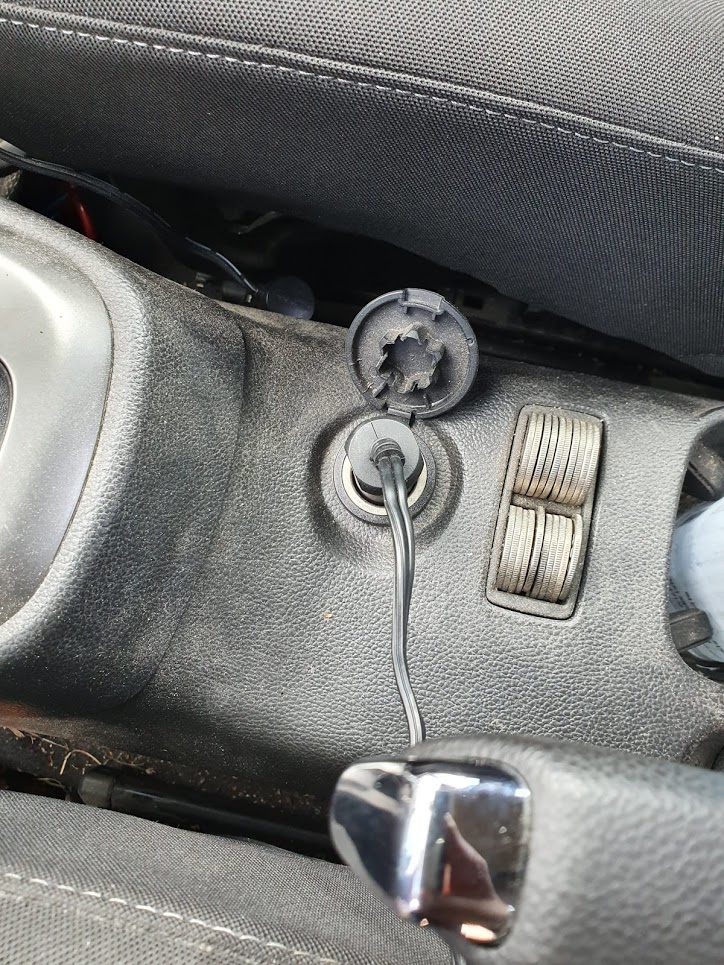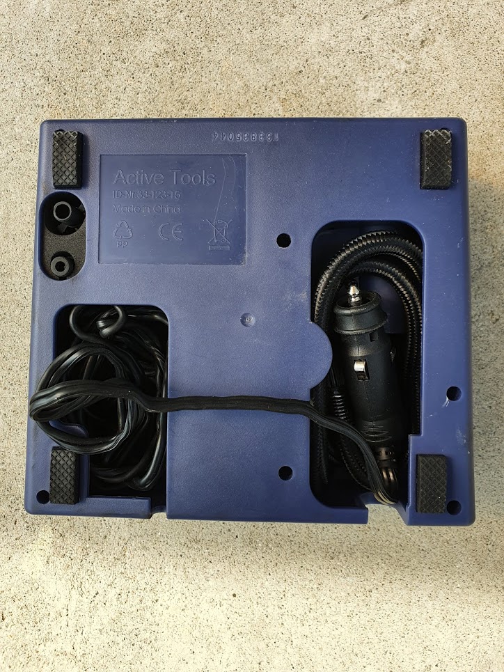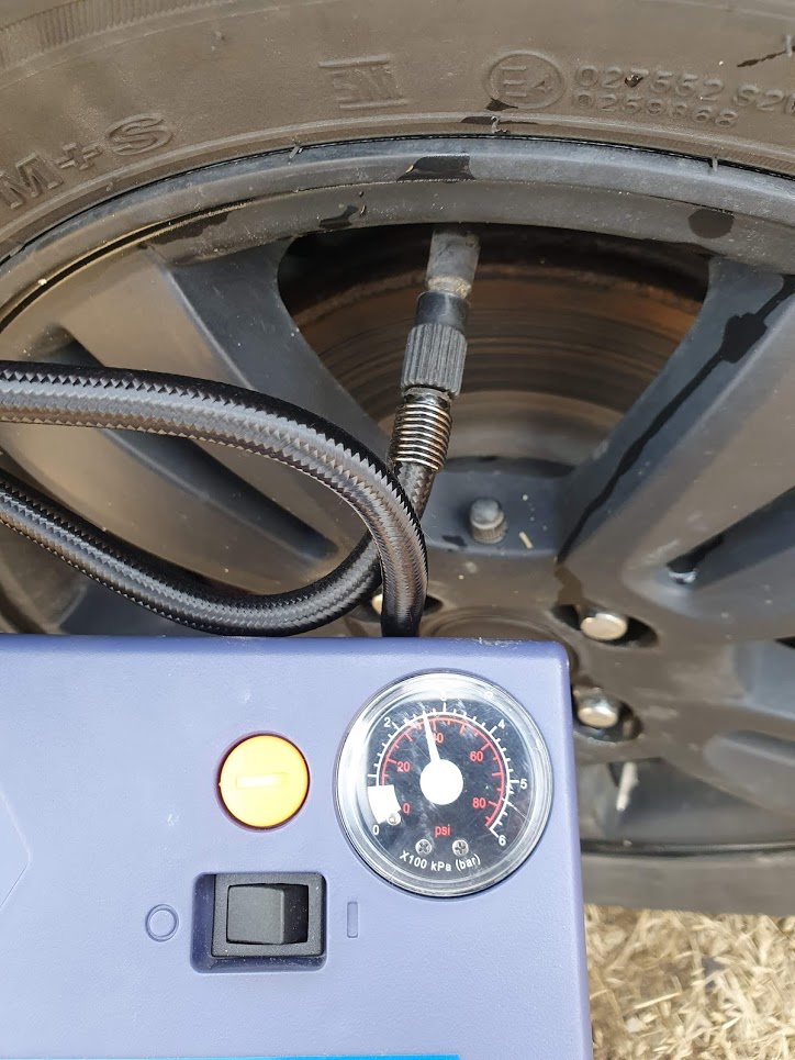 타이어 공기주입구 캡을 열고 위와같이 액티브 툴을 연결하고 주입한다. 스위치를 on하면 상당한 굉음과 함께 공기가 주입된다.