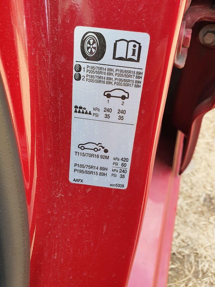 각 차량에 맞는 추천공기압은 보통 운전석쪽 b 필러 밑쪽에 아래와 같이 스티커로 붙어있다.
