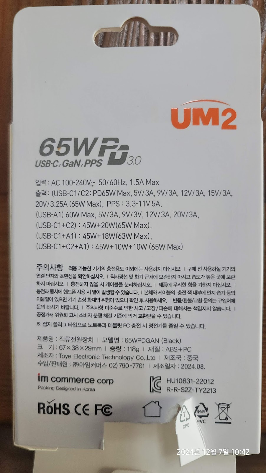 테스트해보니 노트북 충전 잘되고 폰과 동시 충전도 잘 된다. 무게는 기존에 사용하던 그램 충전기에 비해 훨씬 가벼운? 무게이다.(그램 순정어댑터의 무게는 대략 180g 언저리이고 UM2 Gan 65W 충전기의 무게는 대략 110g 정도이다.)