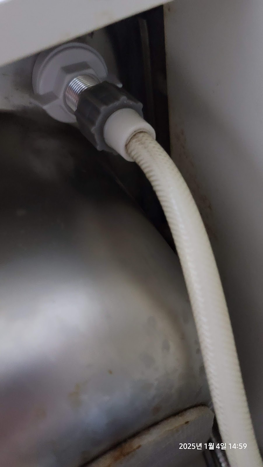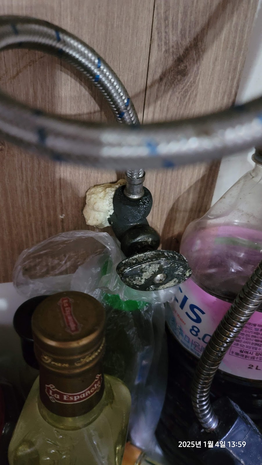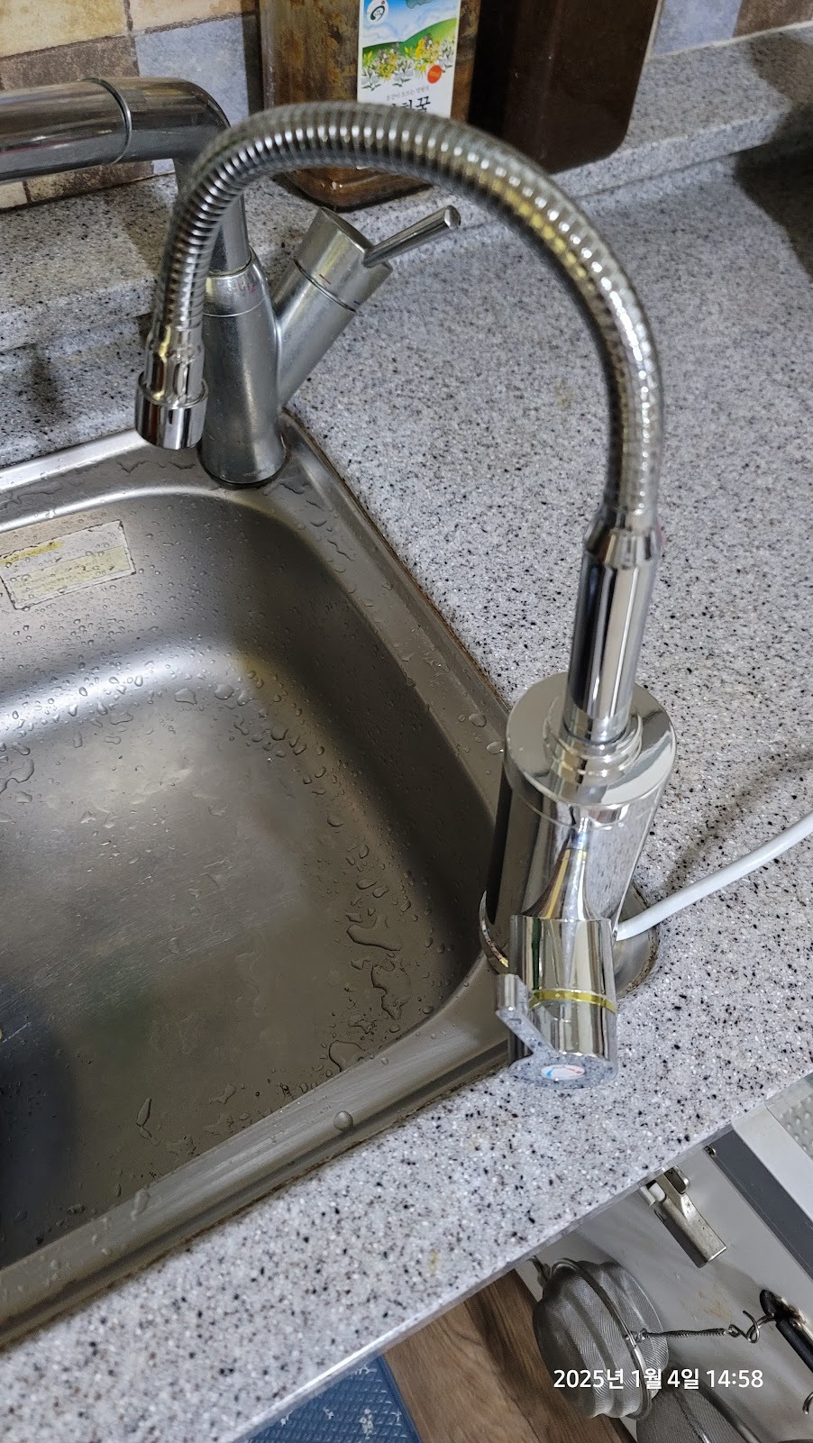 수전연결용 고압호스는 나가서 사와야하나 고민을 하다가 다행히 창고를 뒤져보니 예전에 비데를 교체하면서 보관해둔 고압호스가 있길래 해당호스를 사용하여 아래와 같이 수전에 연결하였다.