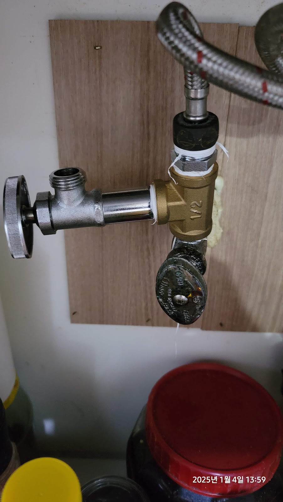 집에 창고에 굴러다니는 수도관련 부품들을 찾아보니 다행히 T자밸브 및 관붙이밸브가 있어서 해당 부품들을 이용하여 기존 수전이 연결된 수도관에 관을 하나 더 연결할 수 있도록 확장하였다.