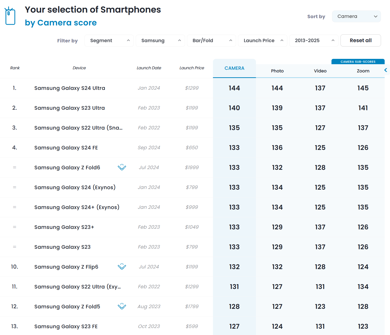 Dxomark는 예전에 꼬꼬마 시절에 한참 DSLR로 사진 찍을때도 렌즈 평가 등으로 많이 거론되는 사이트로 알고 있는데.. 요즘은 어떤지는 잘 모르겠으나..(검색을 좀 해보니 중국자본에 의해? 결과의 신뢰도를 문제삼는 평이 더 많아보인다..) 여튼.. 순위상으로 보면.. (전반적으로 삼성제품 순위가 그리 높지는 않으나... ) 의외로 그렇게 욕먹는 GN3 센서를 사용한 S24/S24+도 삼성제품에 한해서는..? ㅋㅋ.. 나름 순위권이다... 아래는 삼성제품으로만 소팅한 결과 중 상위권 순위이다....