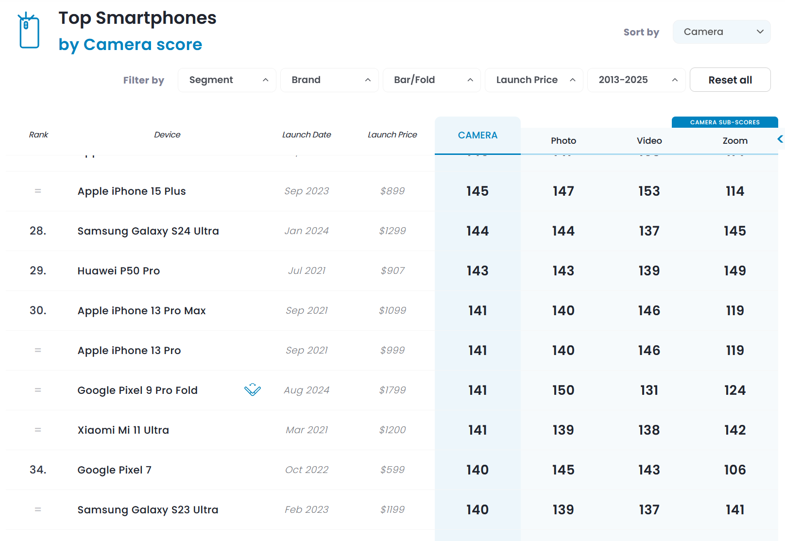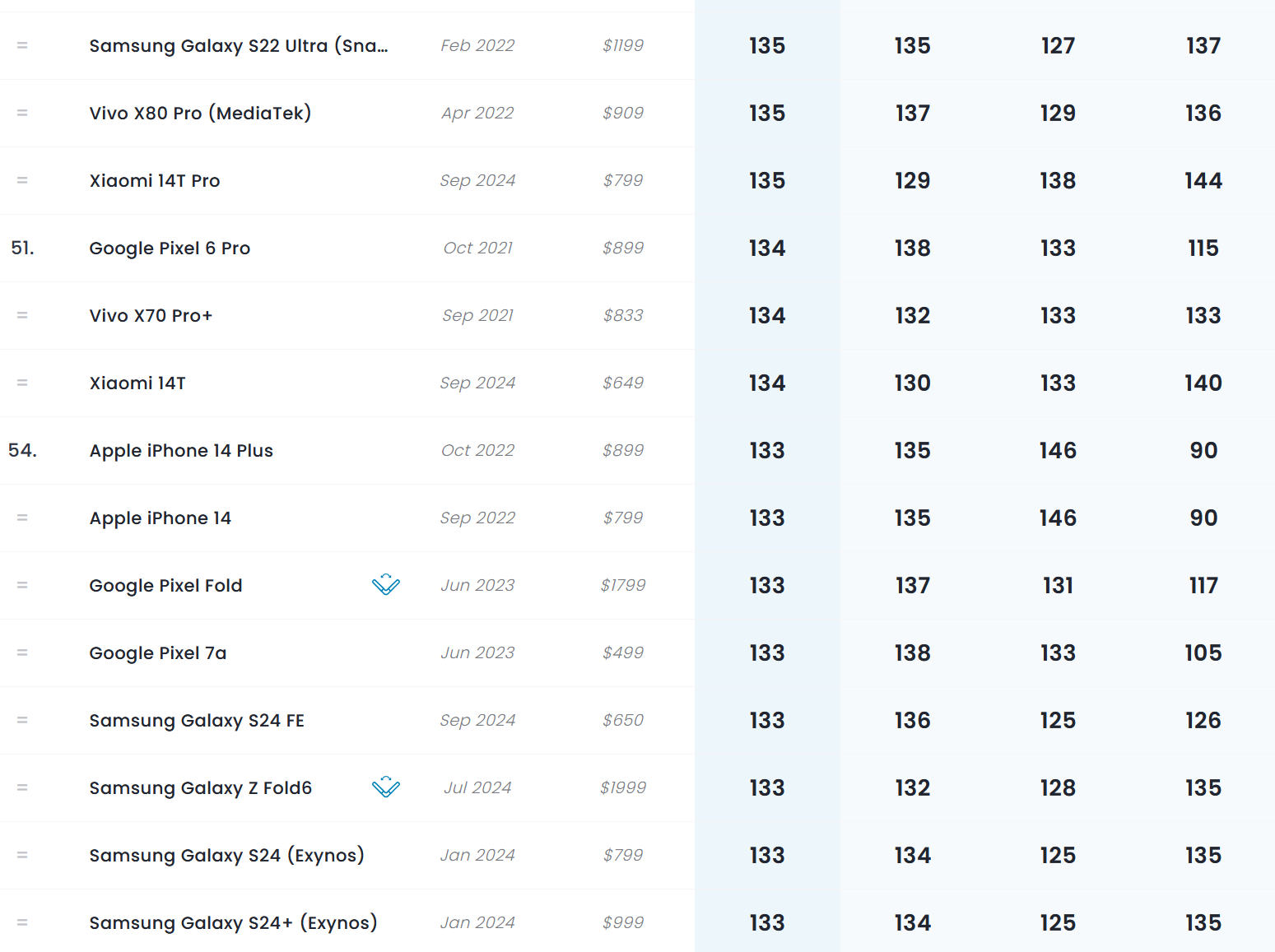 카메라 렌즈/센서 등의 평가에서 나름 신뢰도?를 가지고 여러곳에서 참고되는 평가 사이트 중에 Dxomark 라는 사이트가 있는데(https://www.dxomark.com/smartphones/) S24/S24+ 의 순위를 보면 아래와 같다.
