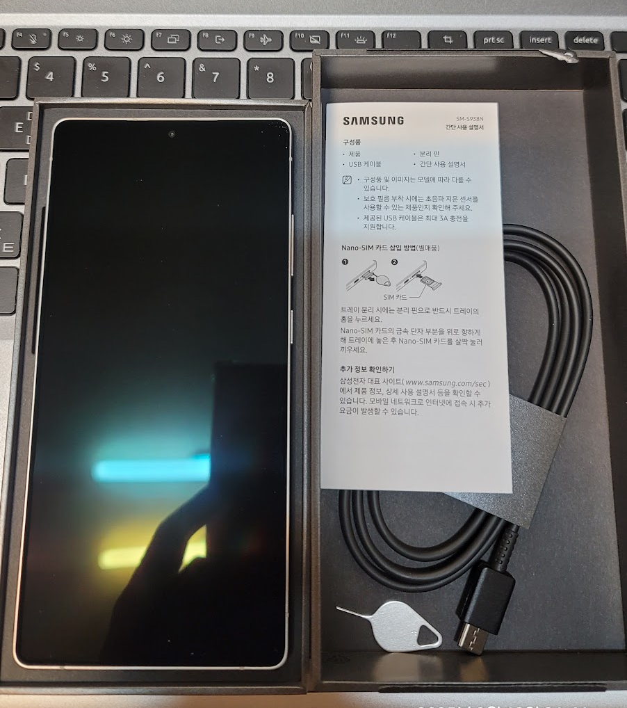 요즘은 충전기도 기본으로 안 넣어주고 그냥 단촐하게 기기 폰체와 c to c 케이블 그리고 유심트레이 분리용 유심핀 정도만 들어있다보니 박스가 참 단촐하다.