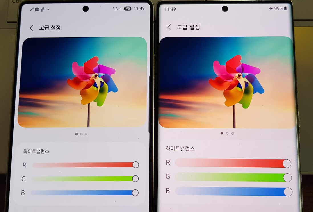 그리고 디스플레이 설정에서 설정을 동일하게 적용하여도 색감이 살짝 다르다. 기존폰에 4년간 적응이 된 화면이다 보니 아마도 새 폰에 또 적응하려면 몇일 더 걸릴듯 하다..(아직도 뭔가 어색함 ㅎㅎ.. 통상 이런 적응은 2주~1달 정도면 금방 적응되니 별 문제 없다..)