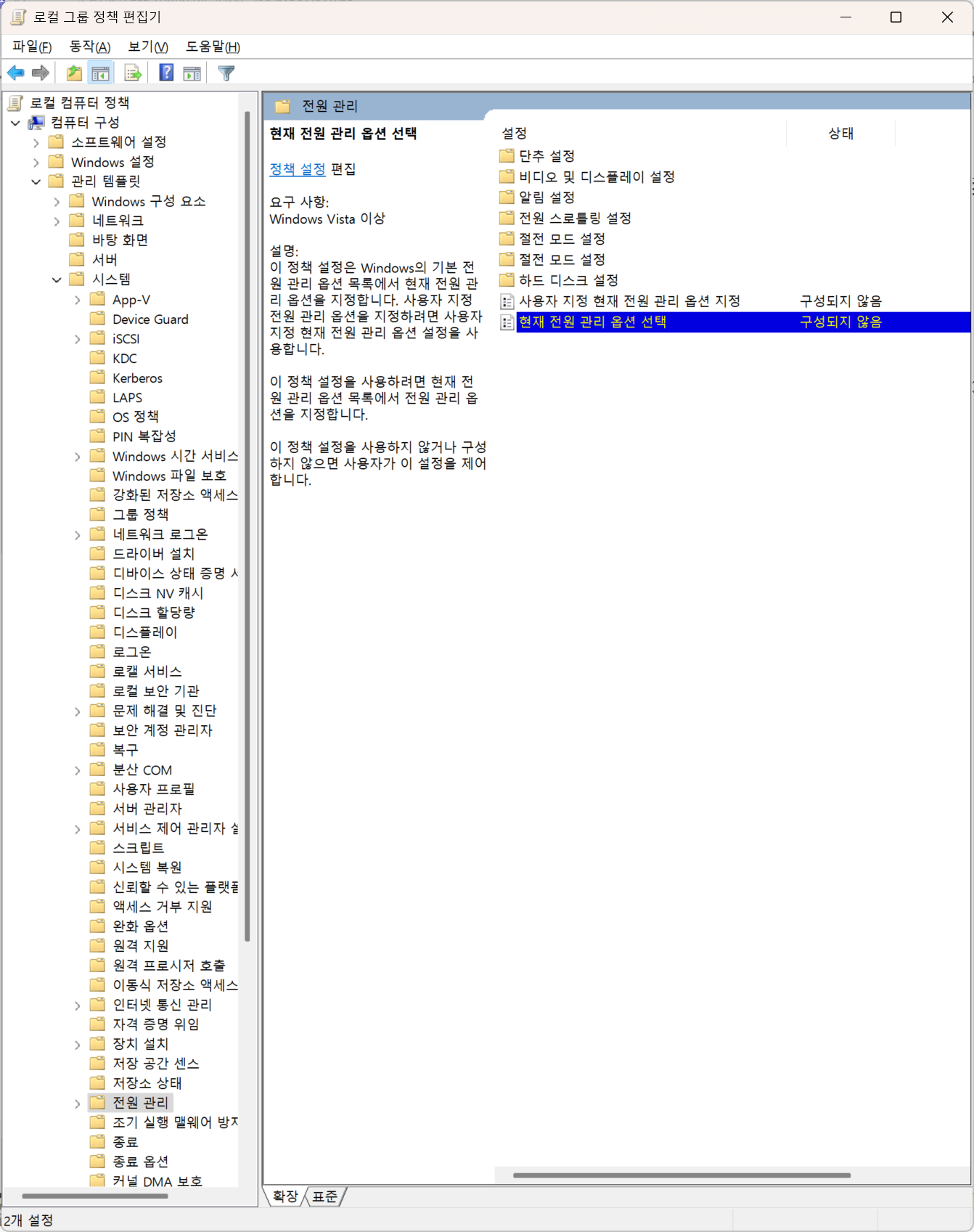 보통 방법들에는 gpedit.msc(정책편집기)를 수행하여 아래와 같이 관리템플릿-시스템-전원관리 에서 현재 전원관리 옵션 선택을 통해서 고성능으로 바꾸거나 powercfg 명령어를 통해서 최고의 성능으로 전원 구성표 GUID 를 변경하는 방법 혹은 레지스트리를 건드려서 변경하는 방법 등 여러가지 방법들이 있다.