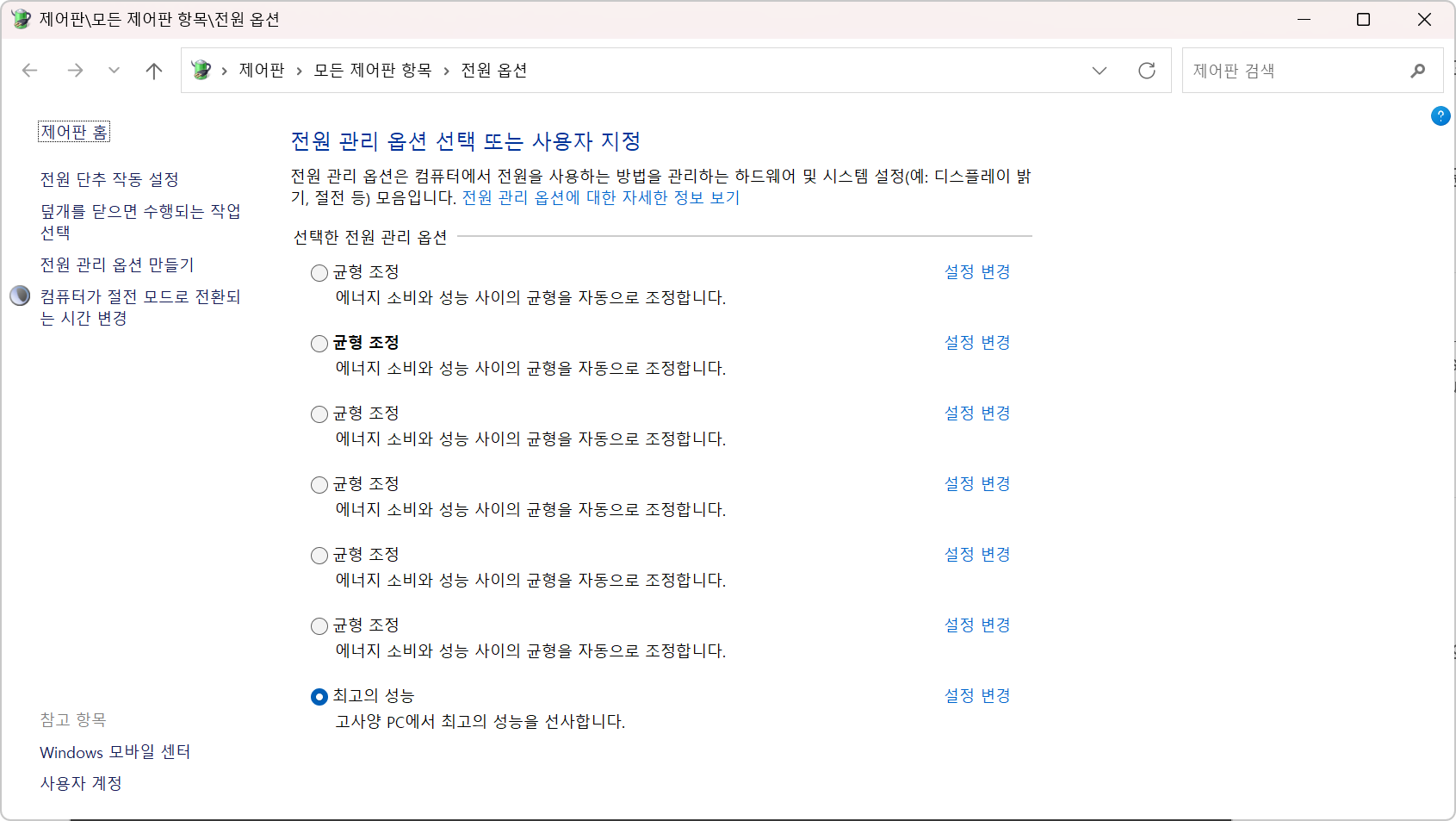 실제로 적용되었는지 확인하기 위해 윈도-R 을 누르고 powercfg.cpl 을 수행하여 전원 옵션 제어판을 열어보면 아래와 같이 잘 적용이 되어있는 것을 확인할 수 있다.