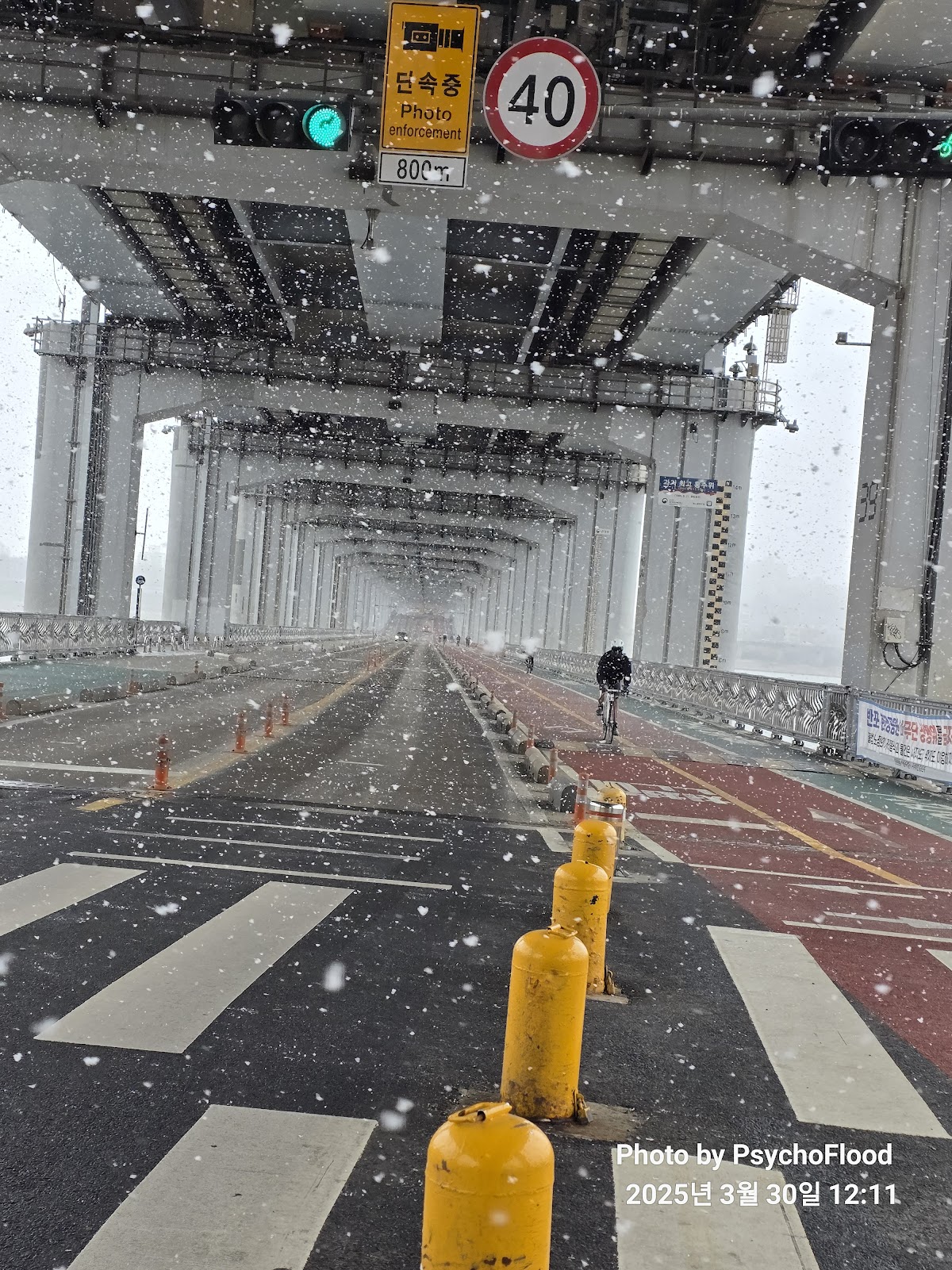 눈이 그리 많이 오지는 않아서... 차라리 눈만 오면 괜찮은데 안양천변으로 들어서니 살짝 비도 섞여서 내리는 듯 하다.. ㅠㅠ