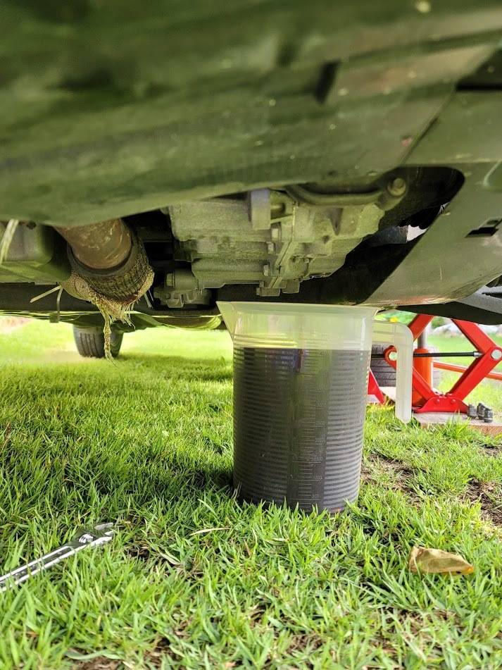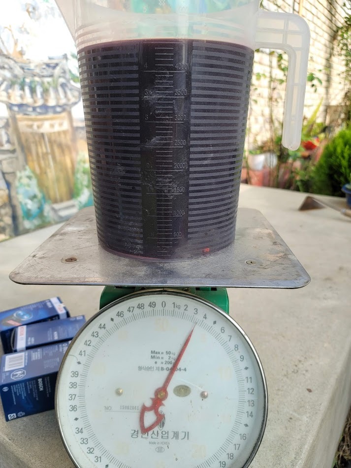 위 사진은 미션오일 1차 드레인한 후 계량하는 장면인데... 비이커의 수치와 저울의 수치가 차이가 엄청나다...
